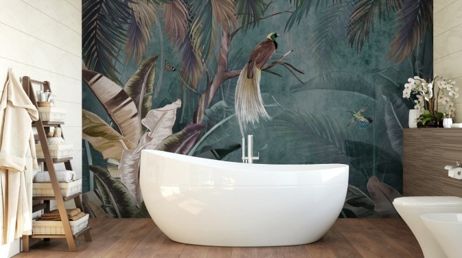 colorful tropical wallpaper mural called Tropical Forest Flowers and Birds at Wallsauce for bedrooms and dining rooms