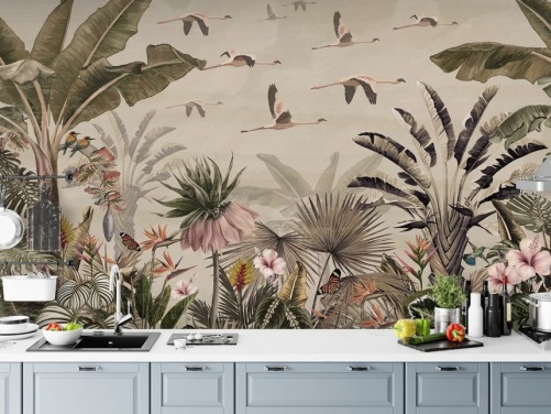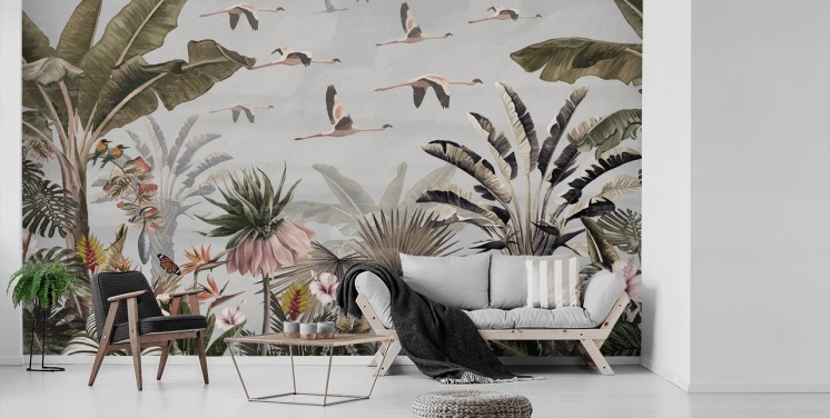 beige jungle wall mural called Flamingos in the Jungle at Wallsauce for bedrooms, living rooms and hallways