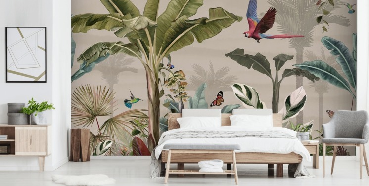 beige jungle wallpaper mural called Parrot Flying Through the Jungle Beige at Wallsauce for bedrooms and living rooms