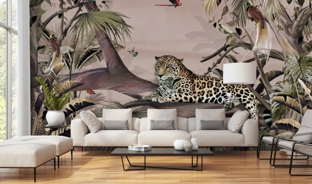 jungle wallpaper mural called A Day in the Jungle at Wallsauce for bedrooms and hallways