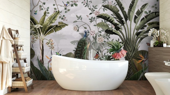 gray jungle wall mural called Jungle Birds and Butterflies Gray at Wallsauce for bathrooms, kitchens and living rooms