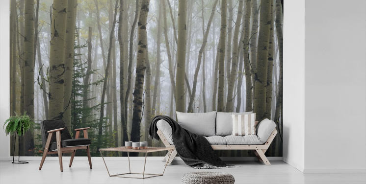 misty forest wallpaper mural called Morning Forest Mist for bedroom, living room or office