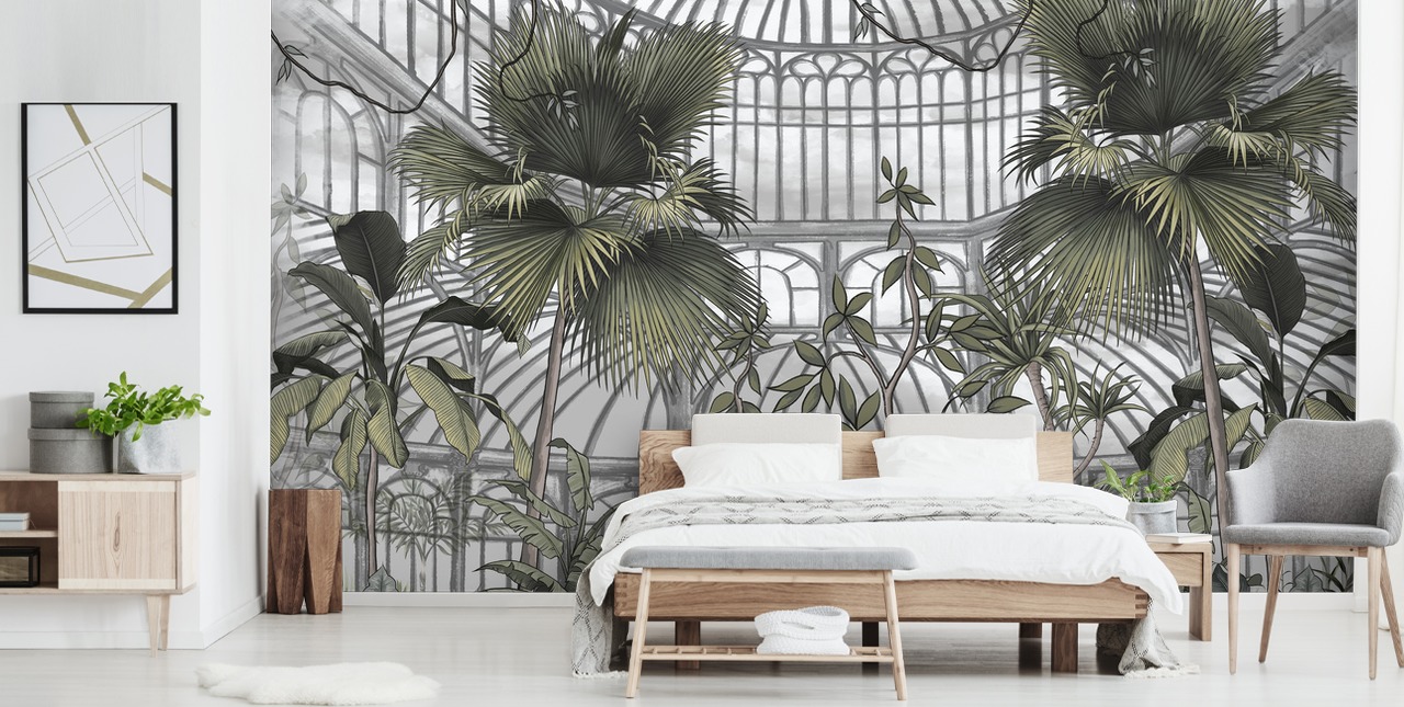 Shop this super stylish Tropical Greenhouse Wallpaper mural now at Wallsauce, perfect for a living room, office or bedroom.