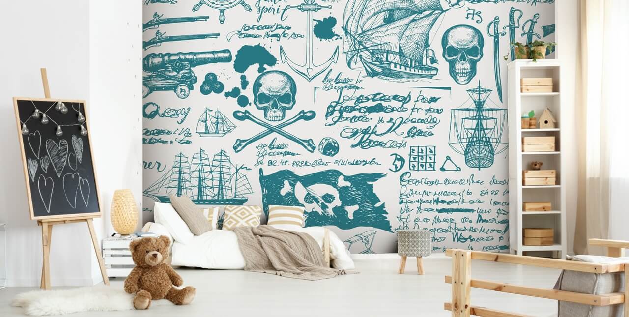 Transform your child's bedroom with this made to measure Vintage Pirate Sketches Blue wallpaper.