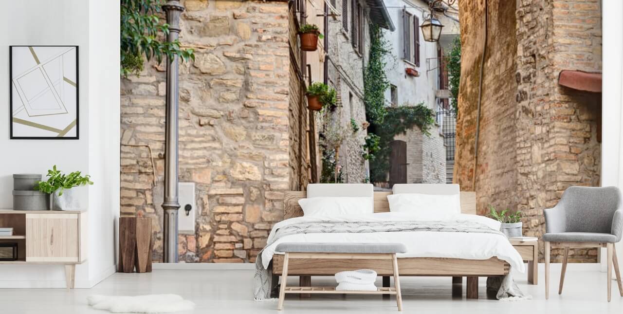 Feel like you’ve travelled to beautiful Italy with this custom-made Ancient Alley in Bevagna, Italy wall mural on the wall. This stunning Italy wallpaper would look amazing in a small room that is lacking space. This is because the archway and distant houses draw the eye forward, convincing your mind that the space is much bigger than it actually is!