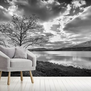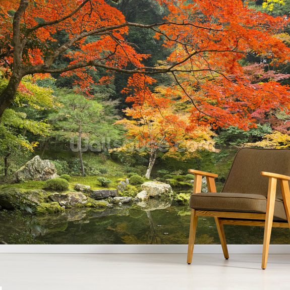 This tranquil woodland scene includes the edge of a lake, jagged rocks, and autumnal coloured leaves on the surrounding trees. Enjoy a woodland walk within this autumn woodland scene by choosing it as your living room or bedroom wallpaper.