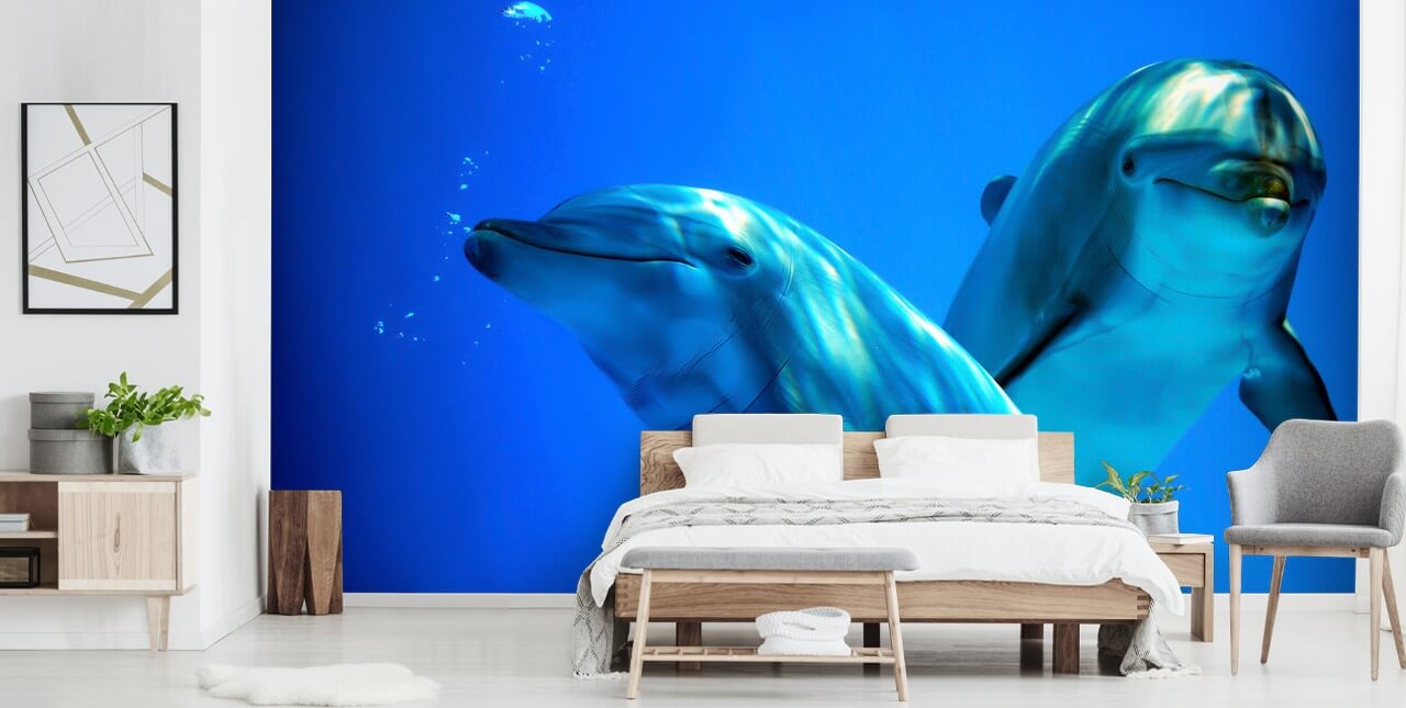 Feel close to these beautiful creatures every day with this stunning Curious Dolphins wallpaper in your home! A stunning shade of blue as well as high-definition photography, this gorgeous dolphin wallpaper will certainly add colour into any room. We think that it would make a great animal wallpaper feature wall in a bathroom!