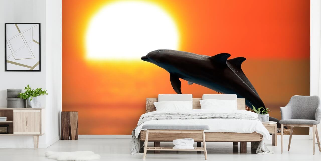 Feel the heat of the sunset and be amazed at the beauty of nature with this fabulous Dolphins at Sunset wall mural in your home or workplace.
