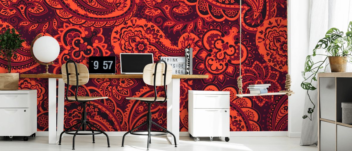 Bring colour and warmth into your home with this exquisite Fiery Red Exotic Patterns wallpaper. Beautiful as a feature wall in a living room, the orange tones in this red wallpaper will bring energy and life into the room – great for when you are socialising! Keep the rest of the room as minimal as possible, however. Choose neutral wall paint and décor but add in a touch of red or orange here and there.