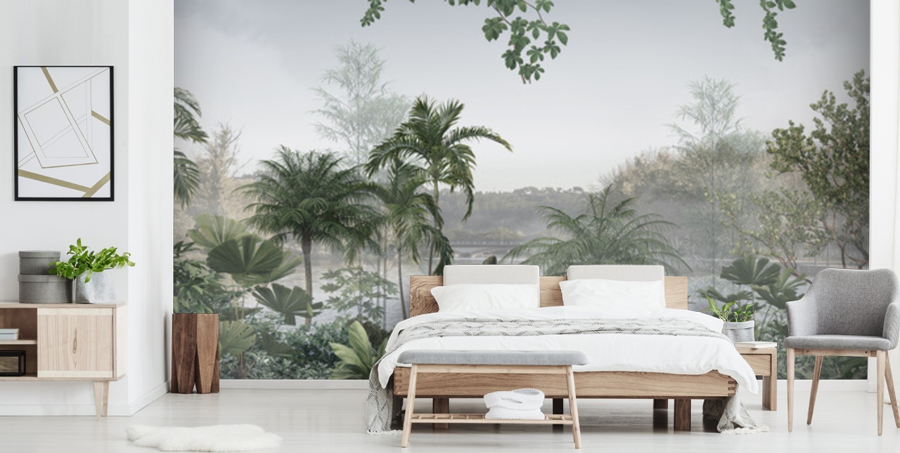 If you were to place this stunning Jungle Panoramic wallpaper mural in your living room, combine it with an emerald green sofa that has exposed wooden legs and adorn it with darker green or brown cushions. Opt for a dark wooden floor and matching furniture and be sure to place a fluffy muted green rug down for a hint of cosiness.