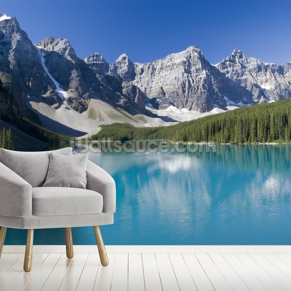 Feel the crisp cold air against your face. Hear an eagle soar overhead. See the snow on the mountain tops, scattered like dusted icing sugar. Feel all these senses when you have this beautiful Lake Moraine in Banff National Park wallpaper installed in your home or workplace.