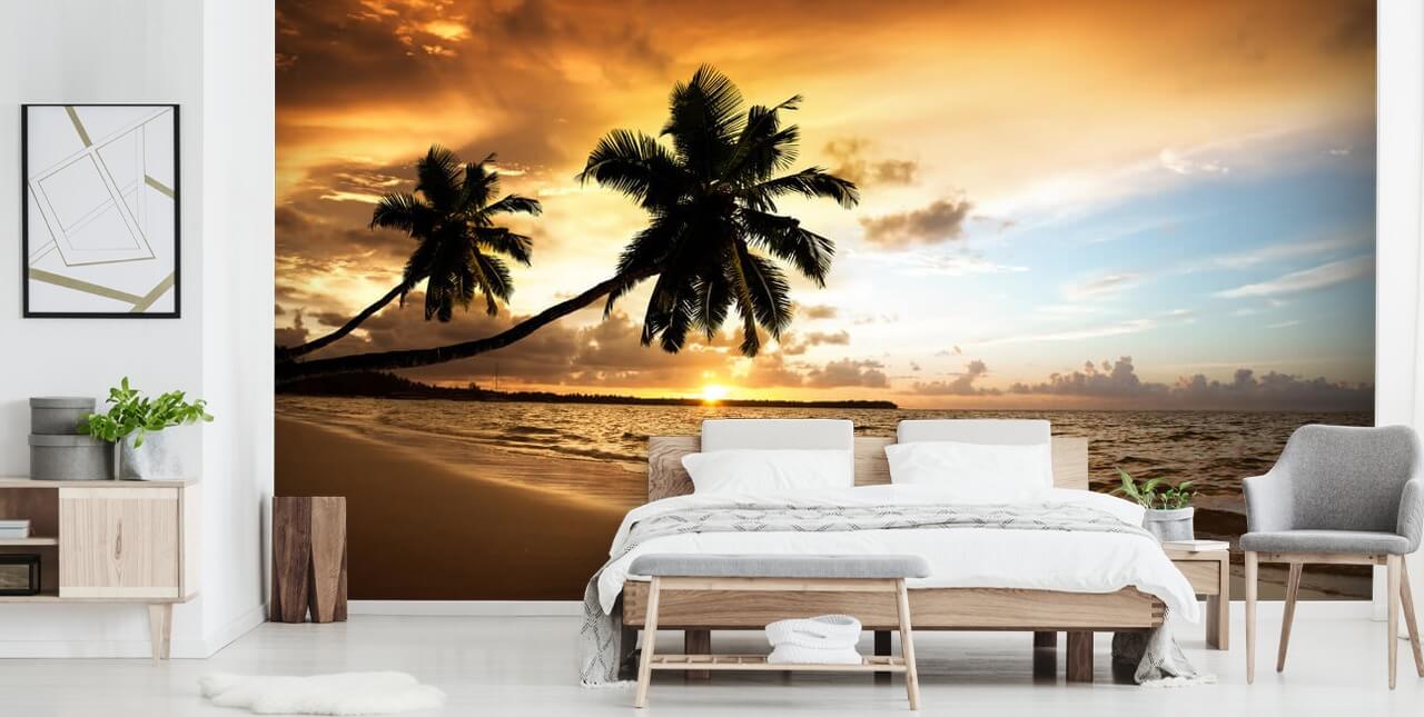 Bring a sense of calm and quiet to your bedroom wall with this beautiful Palm Sunset wall mural! With beautiful orange tones and the reflection of the dying sun's light on the waters, this stunning sunset beach wallpaper is full of colour but very relaxing at the same time.