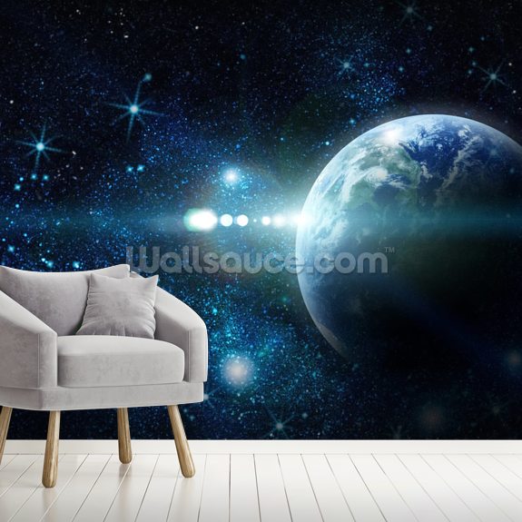 Realistic Planet Earth in Space wall mural from Wallsauce. This high-quality planet wallpaper is custom-made to your dimensions.