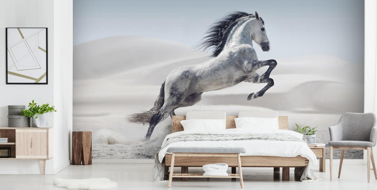 Feel the wild of the outdoors with this stunning Snow Horse wall mural installed in your home. Paint the remaining walls in white or a steely, pastel blue to mirror the wintry skies. Have a selection of silver accents to mirror the gorgeous greys of the horses coat and mane.