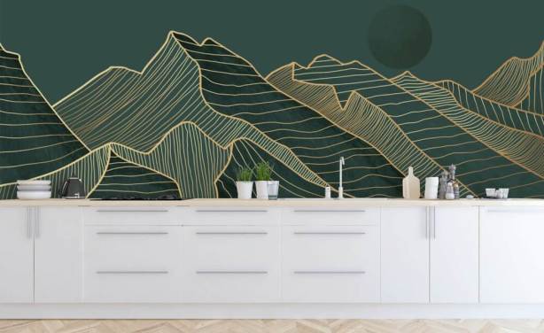 dark green and gold line mountain and moon wallpaper