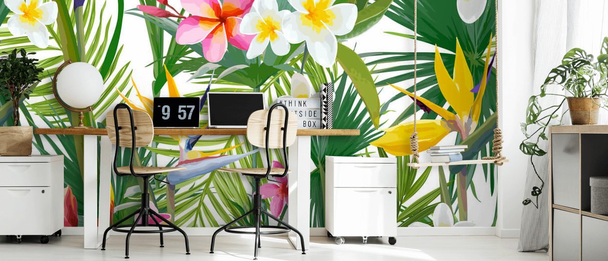 Enjoy tropical leaves and florals? Then why not treat yourself to this stunning Tropical Palm Leaves and Flowers wall mural from Wallsauce.com?