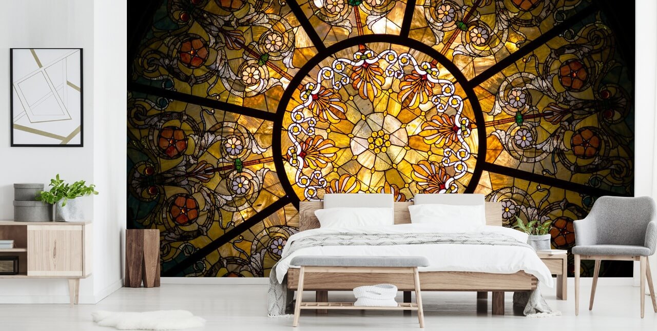 Just imagine this stained glass window-effect wallpaper installed on your ceiling, whether at home or in your church. Keep the remaining walls white and bring in touches of golden accessories to mirror the warm shades used in the window design.