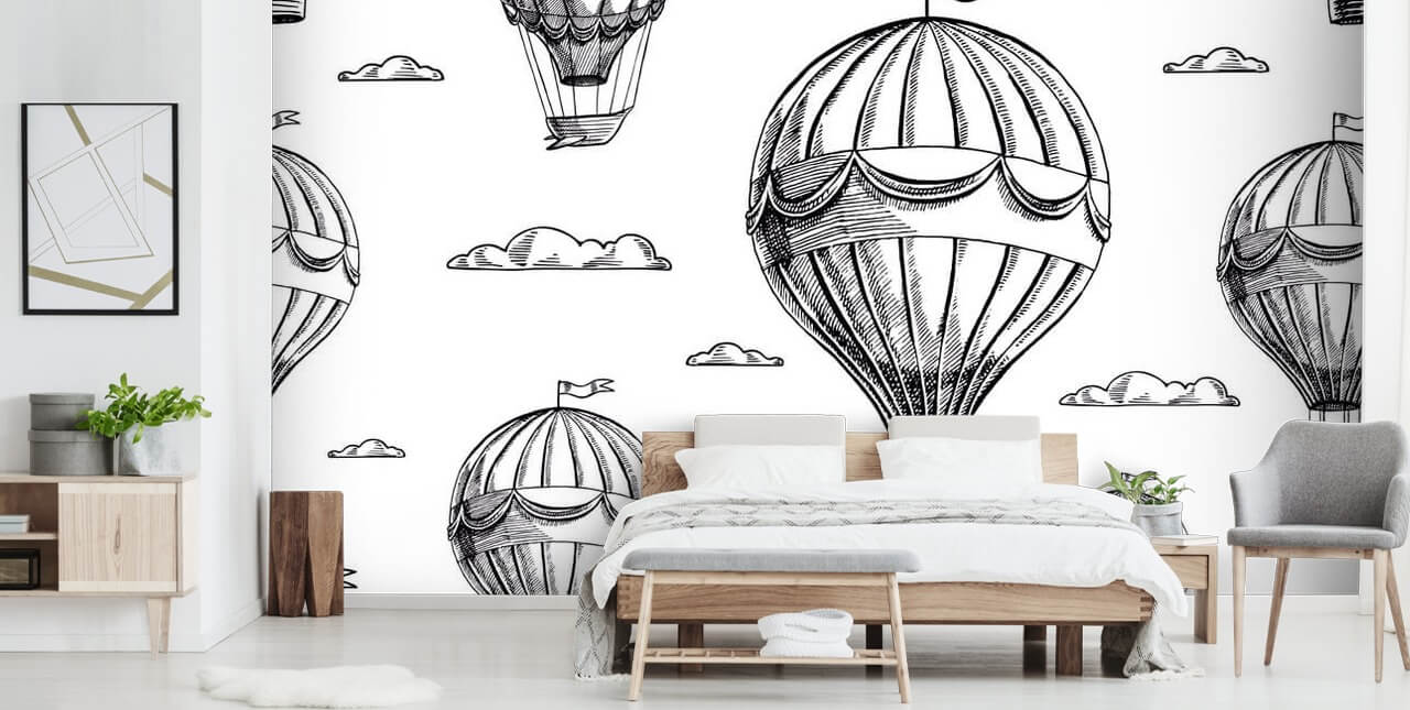 Adventure the endless expanse of sky with this beautiful Vintage Airships wallpaper mural! Simple yet effective, this hot air balloon wallpaper would make a striking feature wall in any room. We think that this vintage-style wallpaper would look amazing in an adorable nursery. Place this black and white wallpaper onto the wall next to their cot and choose cute black and white furniture items. Incorporate one bright colour, such as mustard-yellow, with a yellow rug and curtains!