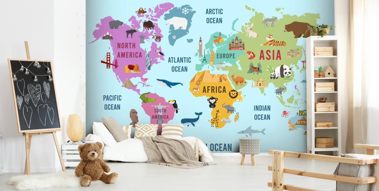 We couldn’t think of a more exciting kids world map than this fun Wonders of the World mural. Designed with vibrant colours, adorable animals and the world’s most famous landmarks, this kids world map wallpaper is a great way to introduce the earth’s wonders to your child.
