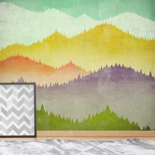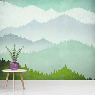green customisable forest wallpaper mural called Misty Mountain Landscape for offices