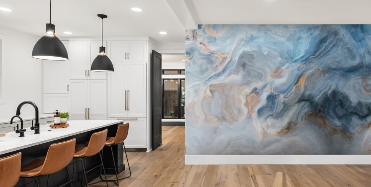 blue and gold watercolour wallpaper mural called Blue with Gold Watercolour for bedrooms, bathrooms and kitchens