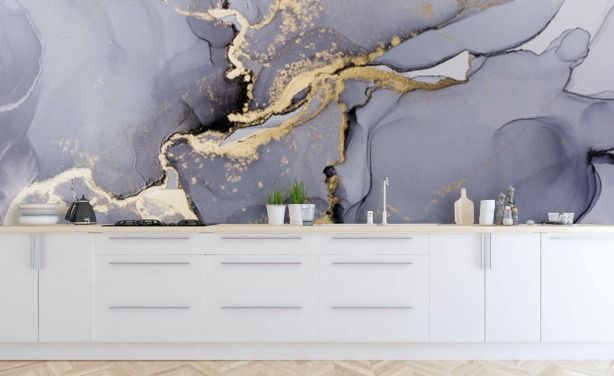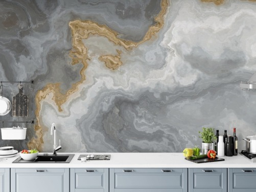 white and gold marble wallpaper mural called White Grey and Gold Swirls Marble for bathrooms, kitchens and dining rooms